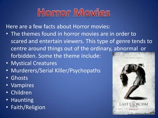 Horror movies aim to scare and entertain viewers through themes involving mystical creatures, serial killers, ghosts, and other disturbing subjects. The author analyzes the opening sequences of three horror films, noting their use of camera shots, editing, sound, settings, victims, and other conventions to build suspense and fear. For their own opening sequence, the author's group challenged some conventions by using teenagers instead of children, balancing diegetic and nondiegetic sound, and not including typical props or costumes.