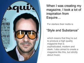 The document discusses how the creator of a music magazine took inspiration from Esquire magazine in developing their publication. Specifically, they aimed to create a high-quality magazine focused on music like Esquire's focus on style and substance. They also emulated Esquire's use of striking front cover images that dominate the page without much text as a way to attract a loyal, sophisticated audience. Similarly, they took inspiration from TIME magazine's simple, clean covers and followed conventions by having dominance of a front cover image layered over the masthead to attract an audience passionate about the featured artist and their music. Their goal was to establish the magazine's focus on young artists and modern music for a young, modern audience.