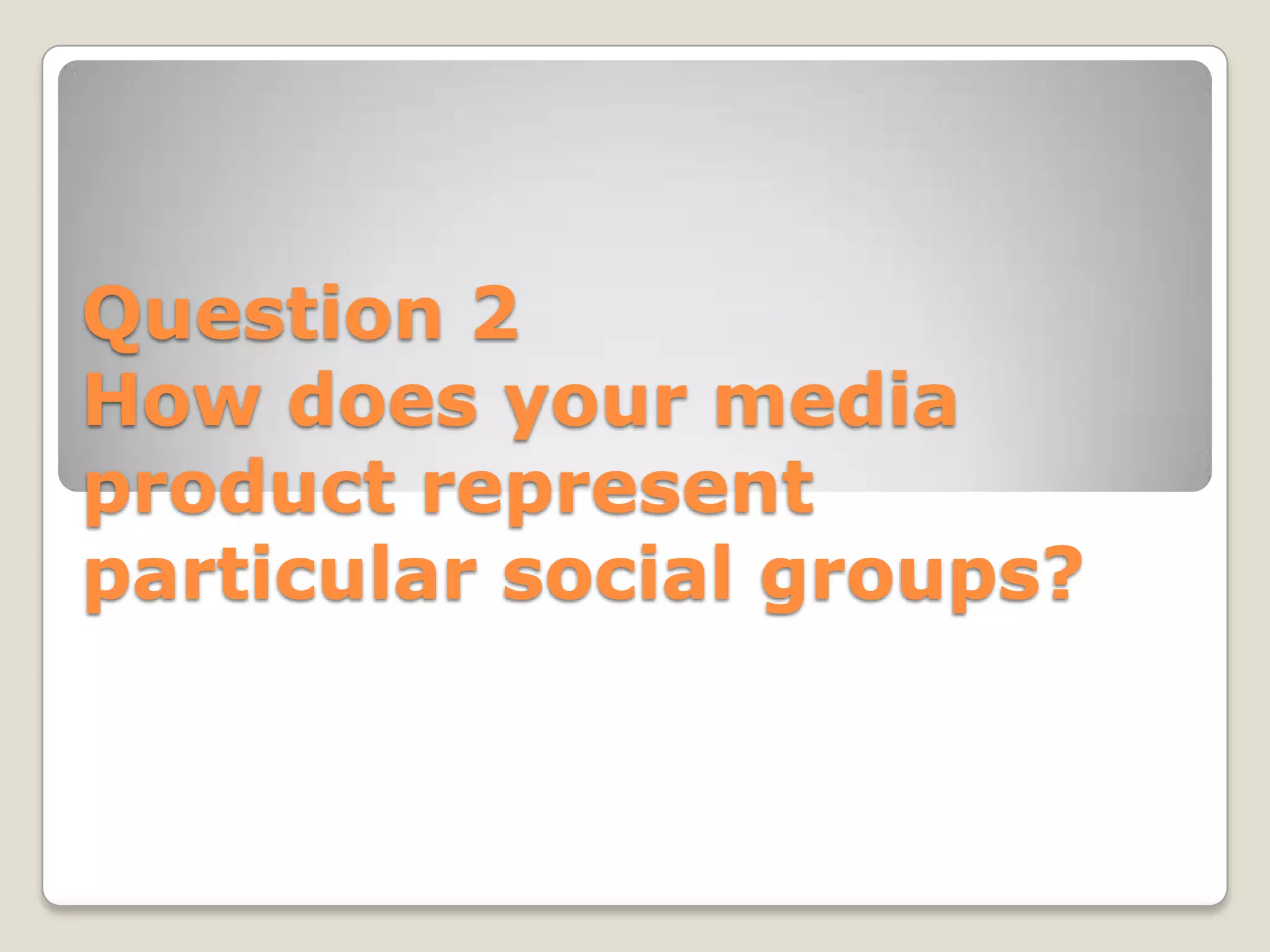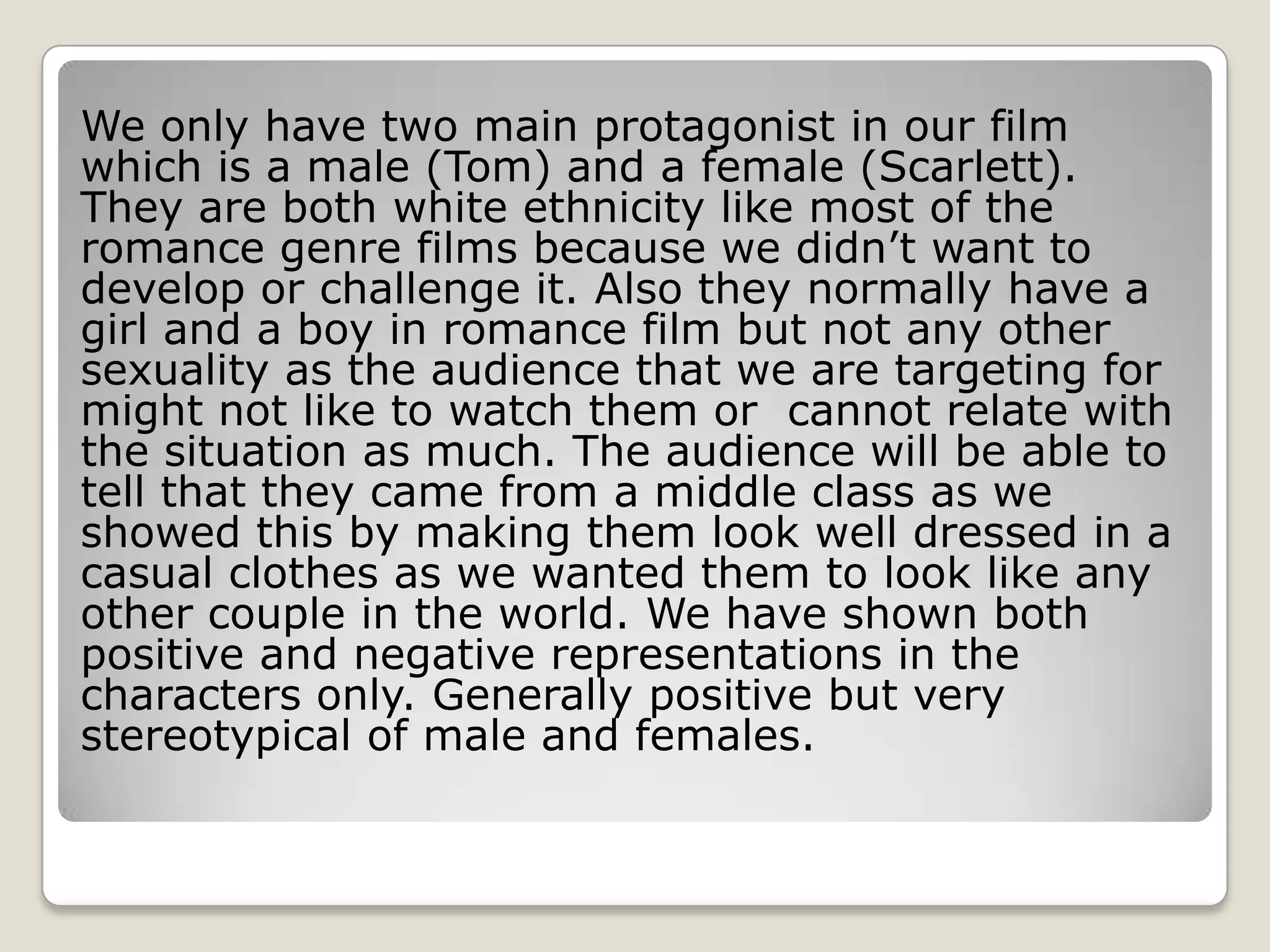 The document discusses how the media product represents social groups. It focuses on the two main protagonists, Tom and Scarlett, who are white and middle class. Both characters conform to stereotypes - Scarlett is portrayed as innocent and pure through her clothing, while Tom initially takes control of Scarlett, implying the male stereotype of dominating women. The document also notes the use of lighting to reflect the happy and positive mood of the characters, drawing on romance genre conventions.