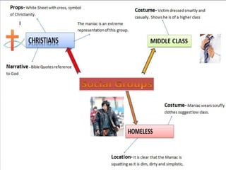 The document discusses the representation of religion, social class, and homelessness in films. It provides the examples of the characters John Doe from Se7en and monks from The Da Vinci Code to represent religious fanatics. The victim Marion Crane from Psycho is used as an example of middle-class representation. Homeless people are often portrayed negatively in media and rarely featured in films.