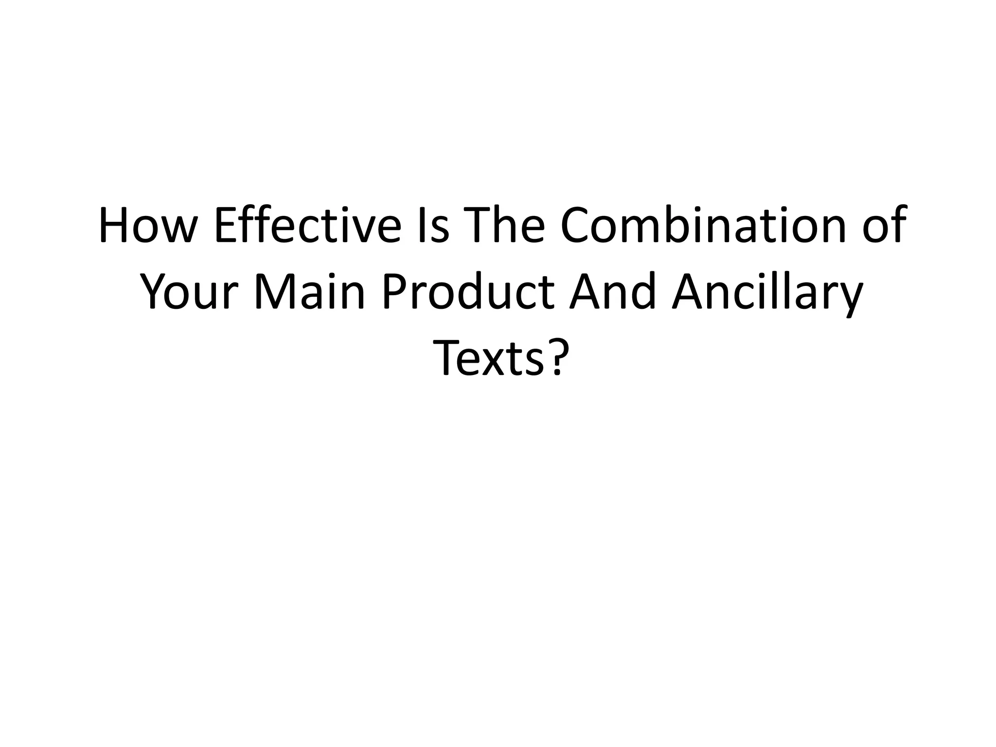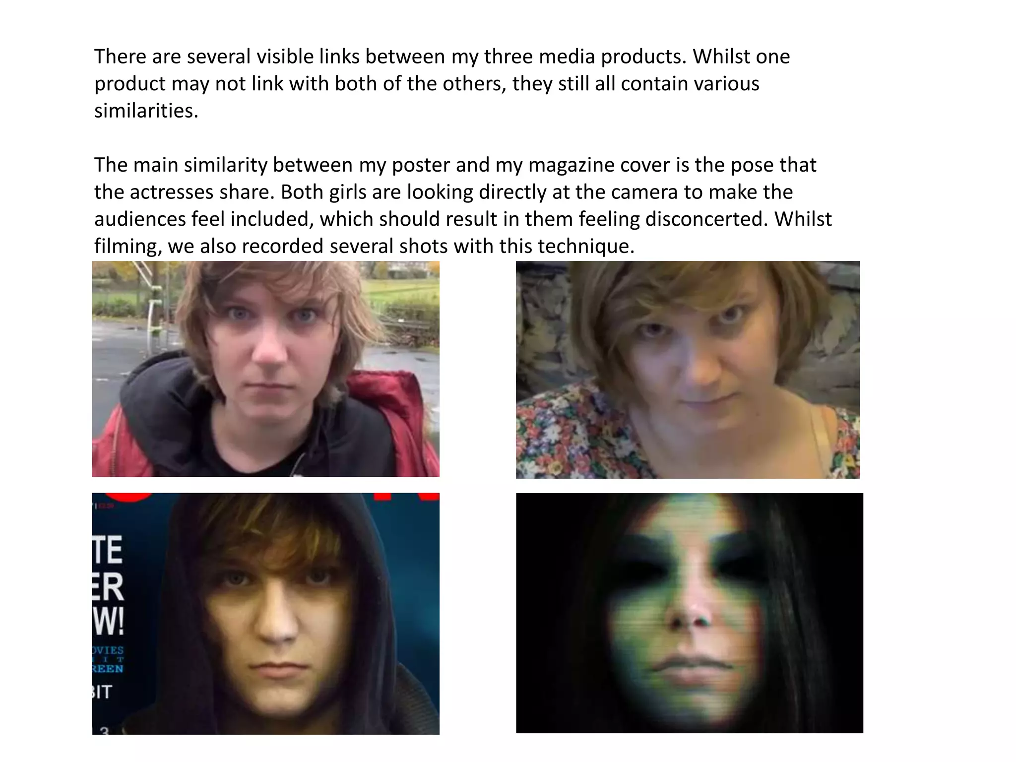 The document discusses the links and similarities between the main product and ancillary texts created by the author. There are similarities in posing of actresses, use of costumes to hide faces and create mystery, and use of the same font for the title in the poster and film trailer. Color schemes and use of logos are also linked between the products to consistently brand them and tie them together visually.