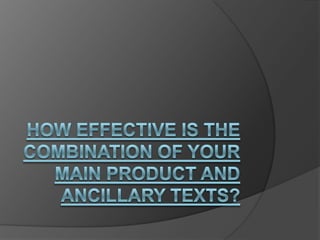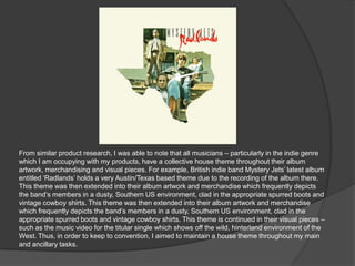 The document discusses maintaining a consistent theme throughout various marketing materials for a music album. It describes establishing an escapist theme focused on time that is portrayed in the music video, album artwork, and additional materials. Specifically, the music video uses actors instead of the artist and focuses on the album's concept of time. The album artwork and additional pieces continue this theme of escapism through imagery of nature and warped time to immerse the audience.