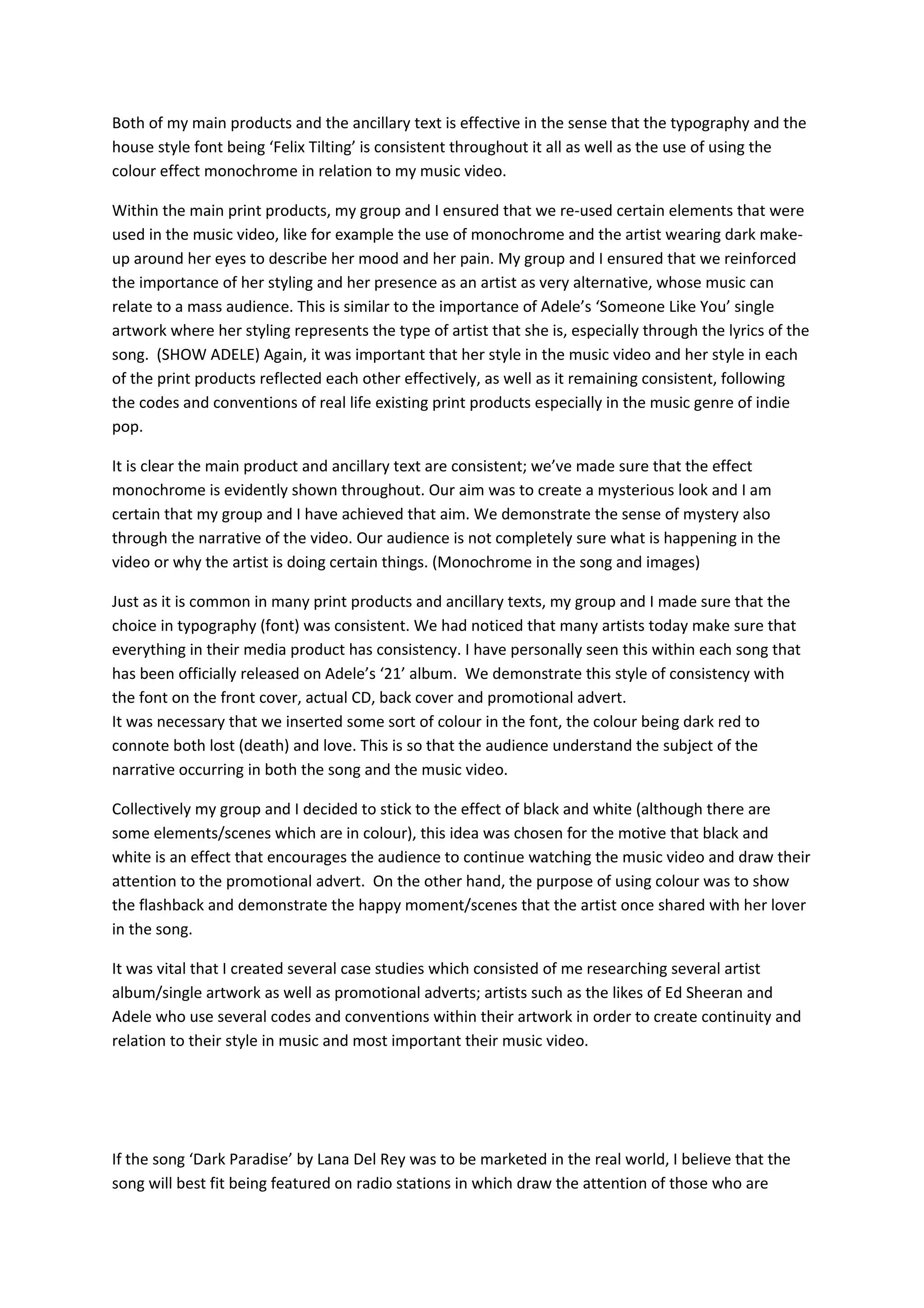 The document discusses consistency in branding across a music artist's products. It summarizes ensuring stylistic elements like monochrome coloring and the artist's alternative image carried over from the music video to print materials. Font and color choices were meant to convey a sense of mystery and emotion. Researching other artists' successful branding informed the design choices. The music would be marketed on indie, pop and mainstream radio stations as well as YouTube and VEVO to reach different audiences. Promotional ads in busy areas like London were also seen as effective.