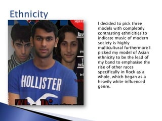 The media product represents different social groups by featuring a band with members of diverse ethnicities, including an Asian lead to highlight the increasing diversity in rock music. The models were chosen to have mixed expressions and no clear facial expressions to appear mysterious. Though the shirt featured is from Hollister, a branded clothing company, it was used to potentially attract audiences interested in fashion from various genres and social groups. The main artists in the band are men to target a mainly male audience that could connect with male artists, and masculine text and colors were used to clearly signal the magazine's focus on male interests.