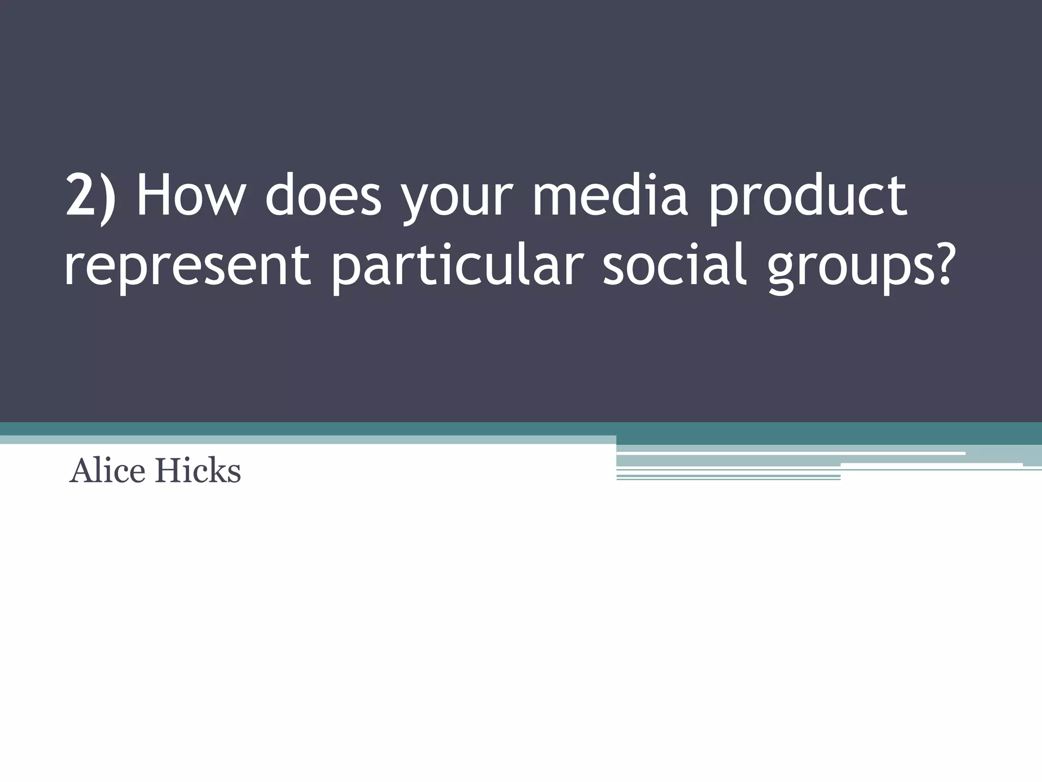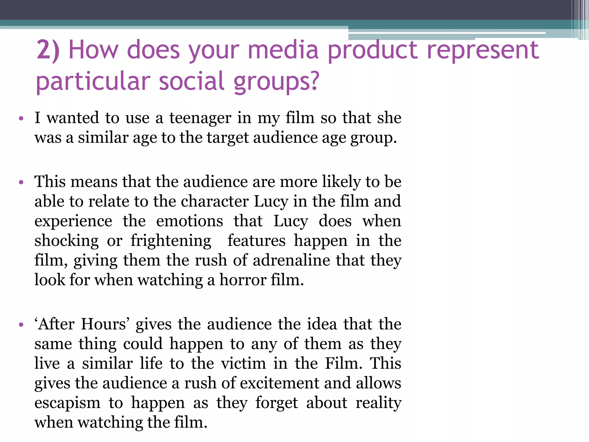 The document discusses how the filmmaker's media product represents various social groups. It represents teenagers by including a teenage protagonist to allow the target audience to relate to her experiences. It depicts the teenager and adults realistically through their costumes and roles in the story. While teenagers are often portrayed negatively, the film depicts the teenager as innocent and in need of help, while portraying the adults negatively when they do not believe her. It also represents women through the stereotypical portrayal of the female protagonist as weak and helpless to appeal to audiences' expectations. Finally, it subverts expectations by depicting a child as dangerous and evil to make the film more frightening.