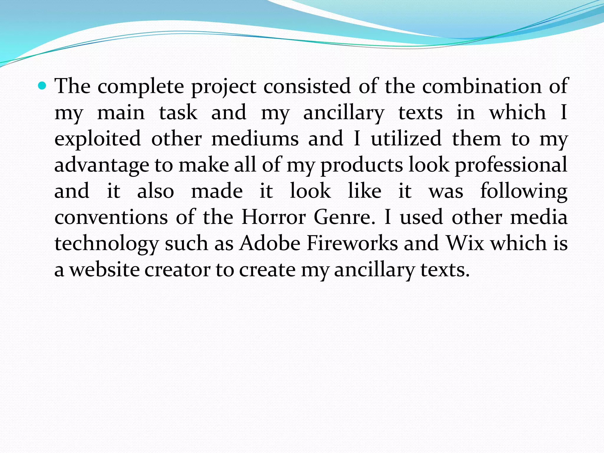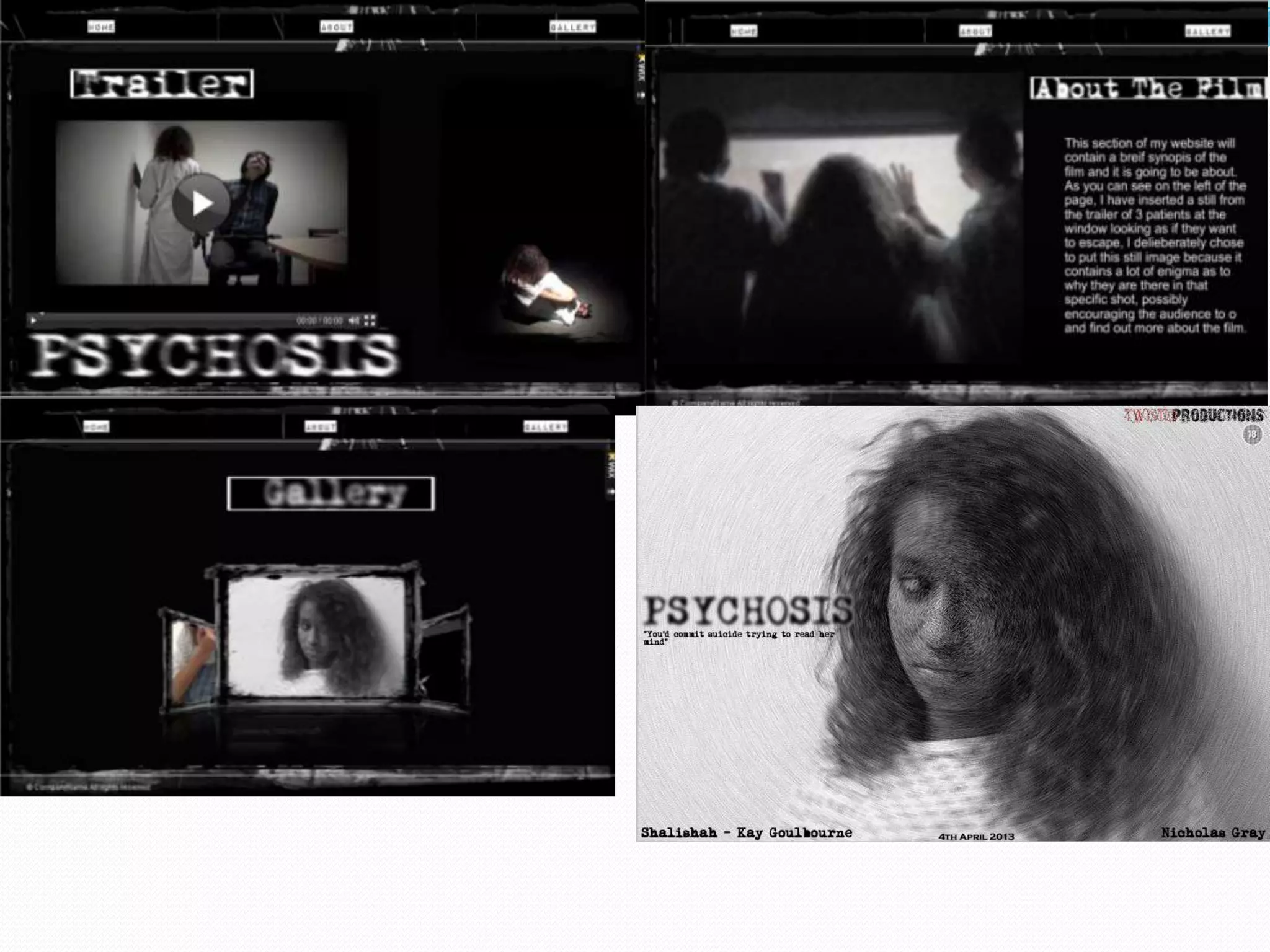 Michael Bangura created a theatrical poster, website, and film trailer for a horror genre project called "Psychosis". He researched conventions of horror genre posters and websites to inform his ancillary texts. The poster and website both utilize a minimal black and white color scheme and enigmatic images from the trailer to pique audience interest without revealing details. This consistency of style and use of mystery across the main task and ancillary texts makes for an effective combination of media that draws the audience in to learn more.
