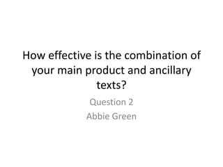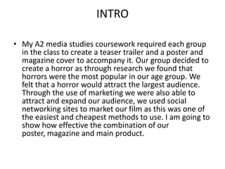 The student created a horror film trailer, poster, and magazine cover as part of a class project. Research was conducted into horror film marketing conventions. The poster featured the main character and title in a dark red font, drawing from common horror poster elements. Likewise, the magazine cover imitated popular paranormal magazines with layered images and enticing text. The trailer was inspired by found footage films like Blair Witch Project to seem realistic and leave viewers unsettled. Through understanding genre conventions and effective use of marketing, the combination of these ancillary texts helped attract a wide audience for the student's main horror film product.
