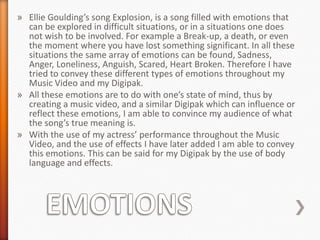 The document discusses Ellie Goulding's song "Explosion" and how she conveys emotions through her music video and album packaging for the song. Specifically, it focuses on conveying loneliness, confusion, and sadness. For the music video, she portrays the main artist as alone to convey loneliness. Overlays and fades create a sense of confusion. Drum sticks and body language suggest anger. The album packaging also aims to convey these emotions through imagery of the lone artist, overlays representing different layers of emotion, and black and white to portray sadness in a relationship. Contrasts between blurred and bold elements show the artist's inability to control inner emotions.