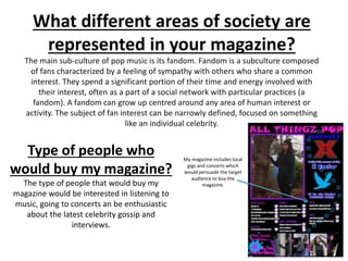 The document discusses how a music magazine represents different social groups. It represents the subculture of pop music fandom, which is composed of fans who share a common interest in pop music. The target audience of the magazine would be teenage girls aged 13-16 from middle-income families who enjoy listening to music and going to concerts. The magazine focuses on Asian British people living in the UK and uses feminine colors and female models, making it targeted towards females. It may not be as appealing to people with disabilities who have a hard time attending concerts.