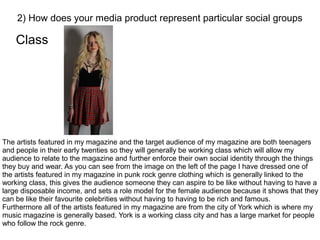 The magazine represents working class social groups through its target audience of teenagers and early 20s individuals, and by featuring artists dressed in punk rock clothing associated with working classes. It also features only artists from the working class city of York. The magazine targets ages 18-early 20s, representing modern rock and punk music genres popular with teenagers. The female artist on the cover enforces stereotypes of thin, attractive women conforming to expectations of looking sexually appealing, while the male artist is represented casually. Only white British artists are featured to appeal to the white majority in Britain and because punk rock features mainly white artists.