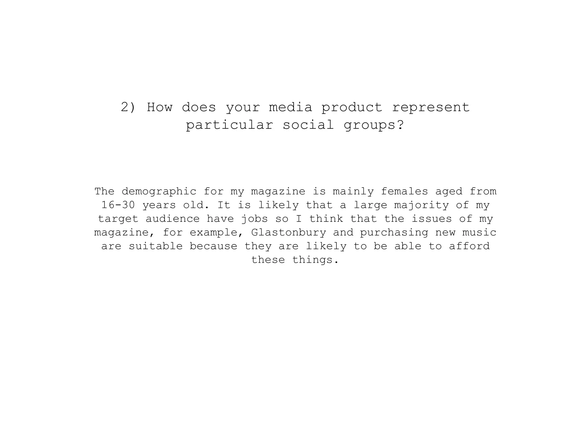 The document discusses how a magazine represents particular social groups through its content and imagery. The magazine's target demographic is females aged 16-30 who likely have jobs and interests in music festivals and new artists. Images used in the magazine, such as of artists performing with guitars, represent the laidback, carefree social group that enjoys folk music. Comparing the magazine's cover to those of other publications shows that a simple, serious style with female artists attracts audiences interested in softer, folk genres, while other magazines use different imagery to target different groups.