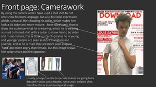 - The front page represents the main artist, a young male, atypically through his mature dress and expression in order to subvert stereotypes of youth.