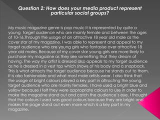 This document summarizes how a music magazine represents its target social groups. The magazine targets young girls ages 10-16 through the use of an attractive 18-year-old male cover star that the target audience finds appealing. Bright colors like blue and yellow are used on the cover to catch the eye of the target audience. The journalism in the magazine uses simple formal language that is easy for its young readers to understand without being informal. Popular artists like Justin Bieber and One Direction that appeal to young audiences are featured on the cover and contents pages.