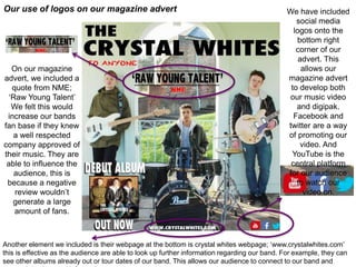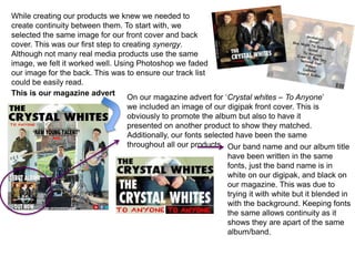 The document discusses creating continuity and synergy across various music products for a band called The Crystal Whites, including their magazine advert, digipak, CD, and lyric booklet. Some techniques used were selecting the same front and back cover image, using consistent fonts, including promotional elements like social media logos and a music video link. Photos of the band members were also consistently featured across products to connect their identity. The goal was to connect the different products and promote the band and their album.