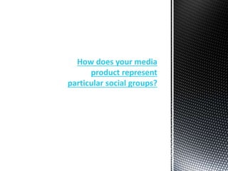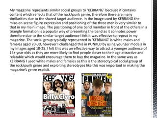 The document discusses how the media product, a magazine called PUNKED, represents the social group of punk/rock music fans. It does this through the imagery used, which features bands posing in ways that suggest rebellious and tough personalities stereotypical of the genre. Younger models than typical were used to attract a slightly younger audience. Fashion and hairstyles in the images also represent current trends within the younger punk/rock fan demographic. Photography techniques like mid shots highlight instruments to represent the musician profession. Clothing worn conforms to typical punk styles but appears high quality to attract a wider, middle class audience.