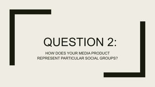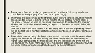 This document discusses how a media product represents social groups. It notes that the target audience is teenagers and young adults aged 15-25. Males are portrayed as stronger while the female depends on the male for help. The male is seen as lower class since he is paid by the female homeowner. Social class is also represented through casual clothing. The ghosts are portrayed as lower class as well. Stereotypes of damsel in distress, hero, and villains are followed at first but later challenged by revealing the female homeowner also loses her sanity.