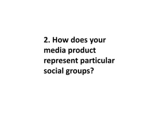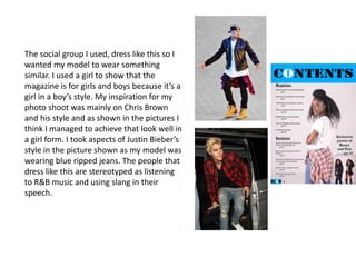 This document summarizes how a media product represents particular social groups. It discusses using a black female model to represent that the magazine appeals to both girls and boys. It aims its target audience at ages 18-25 by featuring clothing styles inspired by musicians like Chris Brown and Justin Bieber that would appeal to those listening to R&B and pop music. It also aims to represent the black Afro-Caribbean ethnicity by using a black African cover star that people of that ethnicity can relate to. It challenges stereotypes by using standard English rather than slang in the journalism, seeking to give a more positive representation than stereotypes of being uneducated troublemakers.