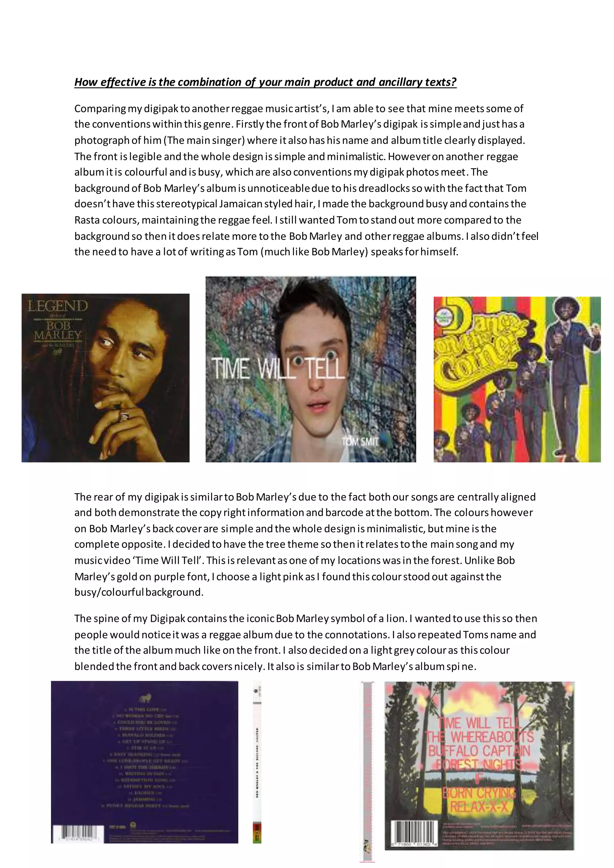 The document compares the creator's digipak, poster, and music video for a reggae artist to examples from Bob Marley and another reggae artist, analyzing how they do and do not conform to conventions of the genre. The digipak, poster, and music video were designed to have similarities like bright colors and busy elements to match the intended happy feeling of the music, while also incorporating conventions like references to Rastafarian culture. Overall the creator feels their works challenge conventions of the genre but still work well as a cohesive package representing reggae music.