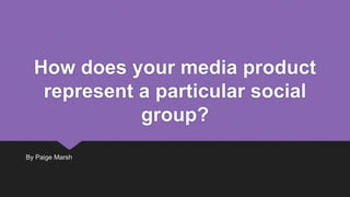 This document analyzes how the author's media product represents a particular social group. It compares an image the author created for their magazine cover to an image from an existing pop magazine. There are similarities in lighting, posing, and casual clothing. Differences include less makeup and a larger smile in the author's image to seem more natural and friendly for a college-aged audience. The document concludes the magazine represents a girl social group aged 16-20 through its portrayal of a college-aged model in casual clothing and a bubbly, pop theme.