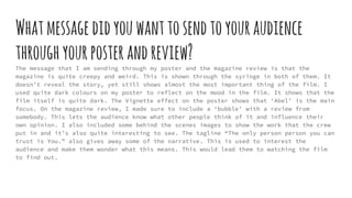 The poster, magazine review, and short film effectively advertise the film by creating intrigue around its mysterious story and dark tone. They work together to tease elements like a syringe and recording button without providing full context, generating questions from audiences and desire to learn more by watching the film. A consistent dark color scheme and inclusion of the main actor across all materials also helps unify these promotional pieces.