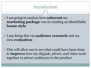 The document analyzes the coherence of the marketing package for a band, including a digipak, magazine advert, and music video.