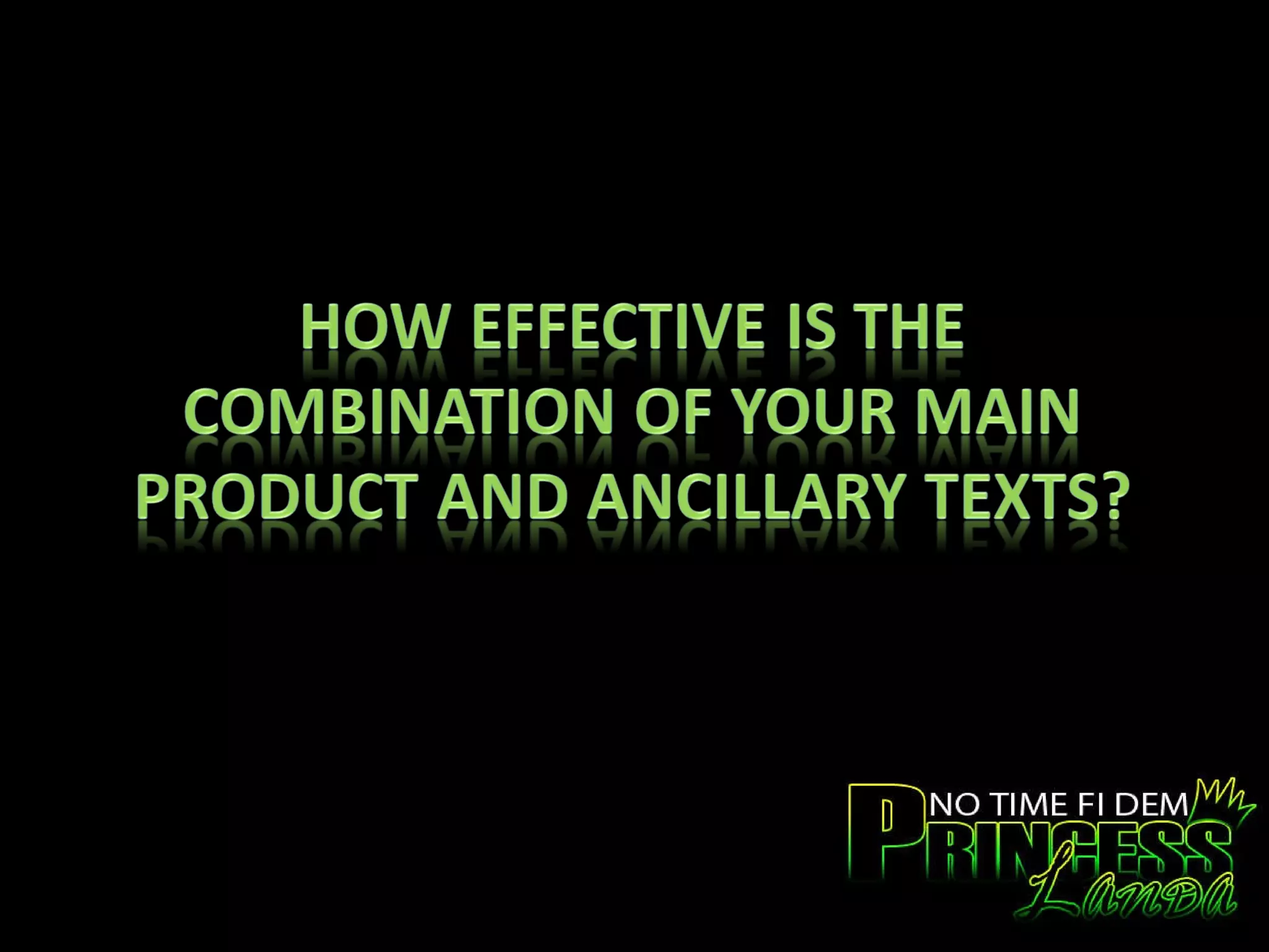 The document discusses how the creator designed their main music video and ancillary texts like a magazine ad and CD cover to be cohesive and reinforce each other. Key elements like costumes, imagery, color scheme, and font are consistently used across the texts to clearly link them and ensure the audience recognizes their relationship and connection to the reggae-themed main product. This unified design is intended to help the target audience relate one media piece to the others and increase the chance they will purchase the CD.