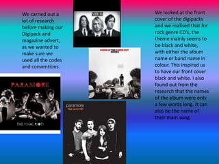 2) Research showed that rock genre packaging commonly uses black and white themes with color text. Inspired by this, the digipack design used a black and white front cover.