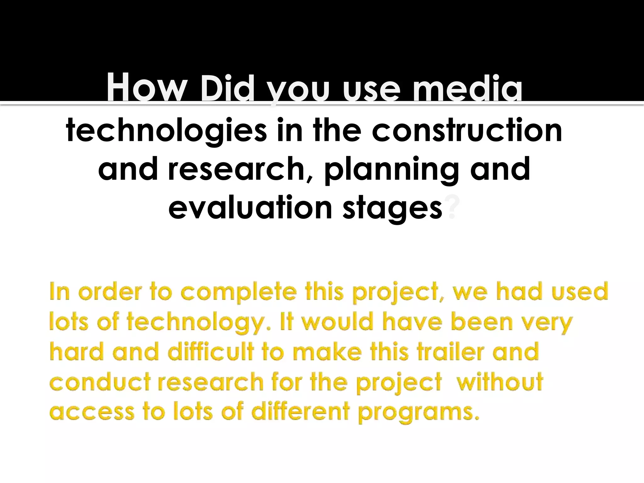 The document discusses the various media technologies used at different stages of a project. At the start, QuestionPro and social media like Facebook and Twitter were used to conduct research and gather public opinion. The responses were then analyzed using Excel to create graphs. YouTube was utilized to analyze existing horror trailers. Google was used to research horror posters and magazines. PowerPoint was employed to present research findings. Photoshop was used to edit photos taken with a Nikon camera for the film poster and magazine. Publisher created templates for the poster and magazine. Serif Movie Plus was used to edit the trailer filmed on a Panasonic camera. Cubase helped record and mix sounds for the trailer in a school studio.