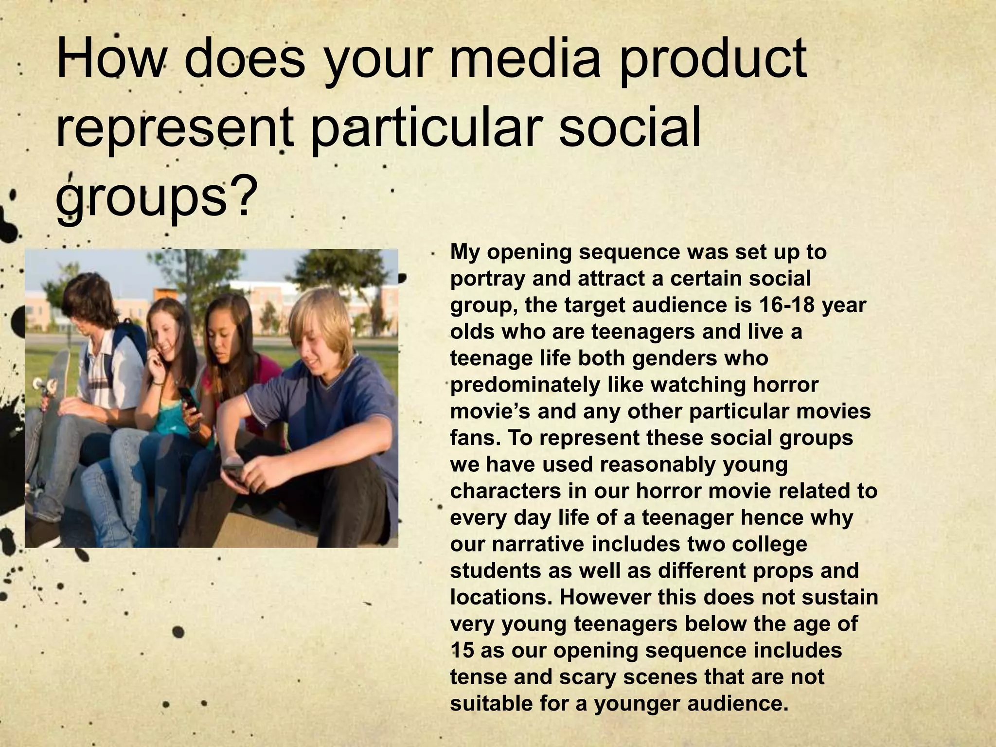 The document discusses how a horror movie media product represents teenage social groups aged 16-18. It sets the opening sequence among two college students, using young characters and locations relevant to teenage life. Props like a mobile phone show the teenagers' social and communicative nature. The narrative of two students meeting in a park represents where many teenagers socialize. The main characters are of different races and genders to represent diversity and portray an innocent victim and stronger killer.