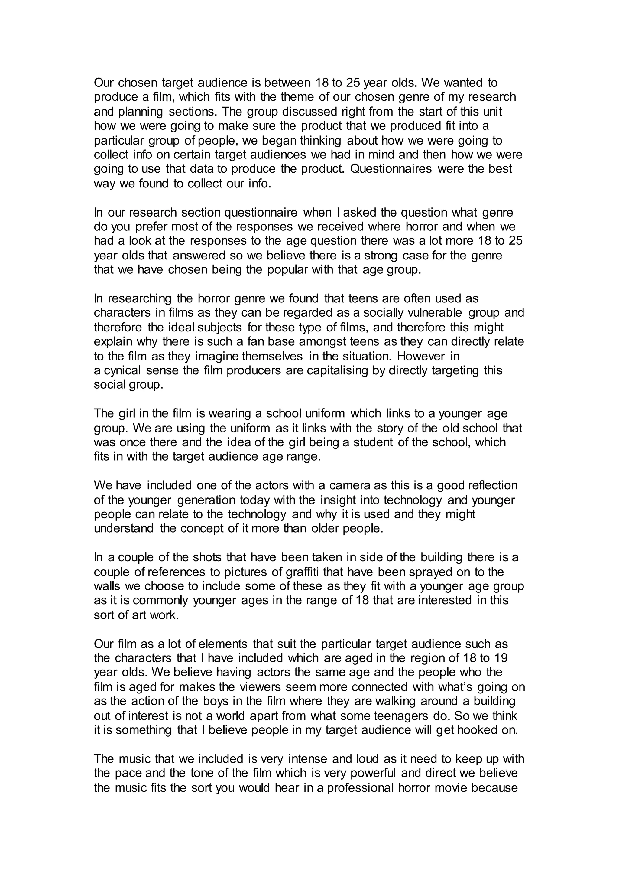 The document discusses targeting a film product toward 18 to 25 year olds. Research was conducted through questionnaires that found this age group preferred horror genre films. Horror films often use teen characters as vulnerable subjects, directly appealing to teen audiences. Elements of the discussed film include a school uniform to link to younger viewers, inclusion of technology like cameras that younger audiences can relate to, and graffiti references and young actor ages of 18-19 that suit the target demographic. The intense music was chosen to match professional horror films and appeal to younger audiences who tend to prefer louder music and horror genres.