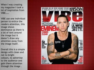 The document discusses magazine design inspiration taken from VIBE magazine. VIBE uses a single dominant image of an individual to draw the reader's attention. It has simple, not too bright colors and clean design. The cover lines are also simple to keep the focus on the central image. The author aimed to follow VIBE's setup of a dominant central image overlaid on the masthead to showcase the artist rather than the magazine name. A mid-shot photo from the waist up was used to target young, trendy, modern readers.