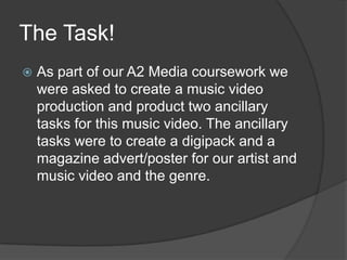 This document summarizes the branding and marketing work Denisa Sykaj did for an A2 media coursework project involving creating a music video, digipack, and magazine advertisement for a rap/hip-hop artist. It describes researching existing rap/hip-hop brands to develop an identity representing the genre. Images were chosen for the digipack that portrayed the artist's style and fit rap conventions. The packaging and ad were designed to appeal to the target audience of 17-19 year olds through visuals and labeling.