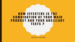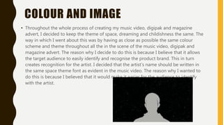 The document discusses the design choices made for an artist's music video, digipak, and magazine advertisement. Throughout all products, the same color scheme, space/dreaming theme, and unique font were used to consistently brand the artist and make them easily identifiable. Locations in the music video of a toy-filled room and outer space through green screen reinforced the song's themes. Costumes featured middle-class attire with special effects, mimicking styles of inspirational artists Owl City and La Roux. The combination of main and ancillary products was deemed effective in communicating the artist's identity and message.