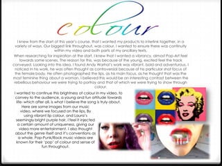 The document discusses the creator's process for developing interlinking media products to promote an indie rock band called Autumns Abandoned. Key elements like color, shots of lips, and individual band member colors were carried through the music video, digital packaging (digipak), and website. Flirtatious eye contact shots from the music video were also featured on the digipak cover. The goal was to create a recognizable style and build recognition of the band across all products. Social media was also utilized to further promote the band's content.