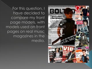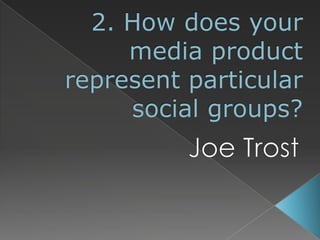 Joe Trost's media product represents the social group of students. The magazine cover features a central image of a male model playing a guitar at a low angle shot, similar to covers of real music magazines. This intimidating shot represents iconic artists. The magazine's minimal pages and direct fonts appeal to busy students. The affordable price, technology-focused website, and rebellious graphic elements also aim to represent students. The primarily male target audience is reflected through masculine colors, imagery, and fonts.