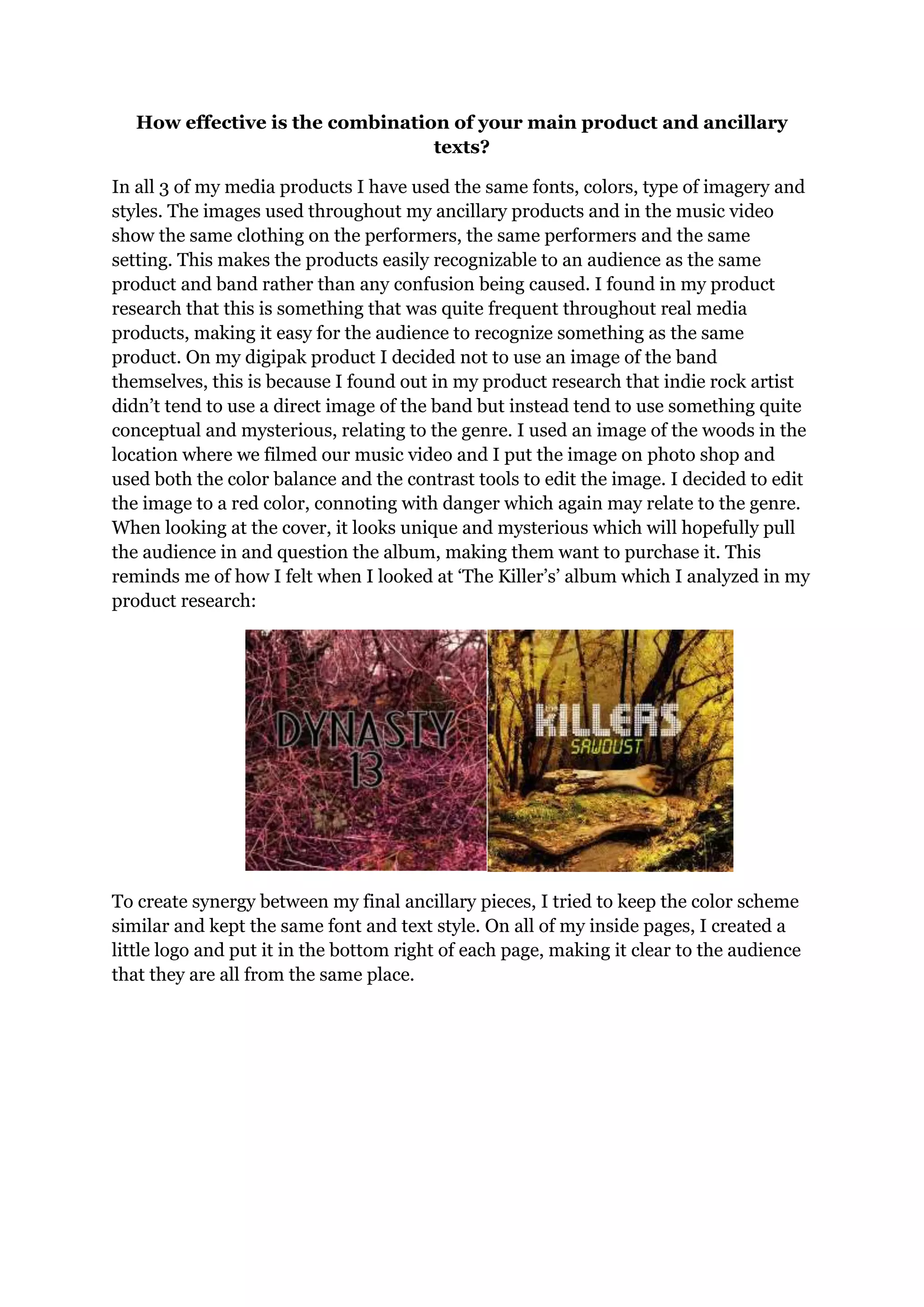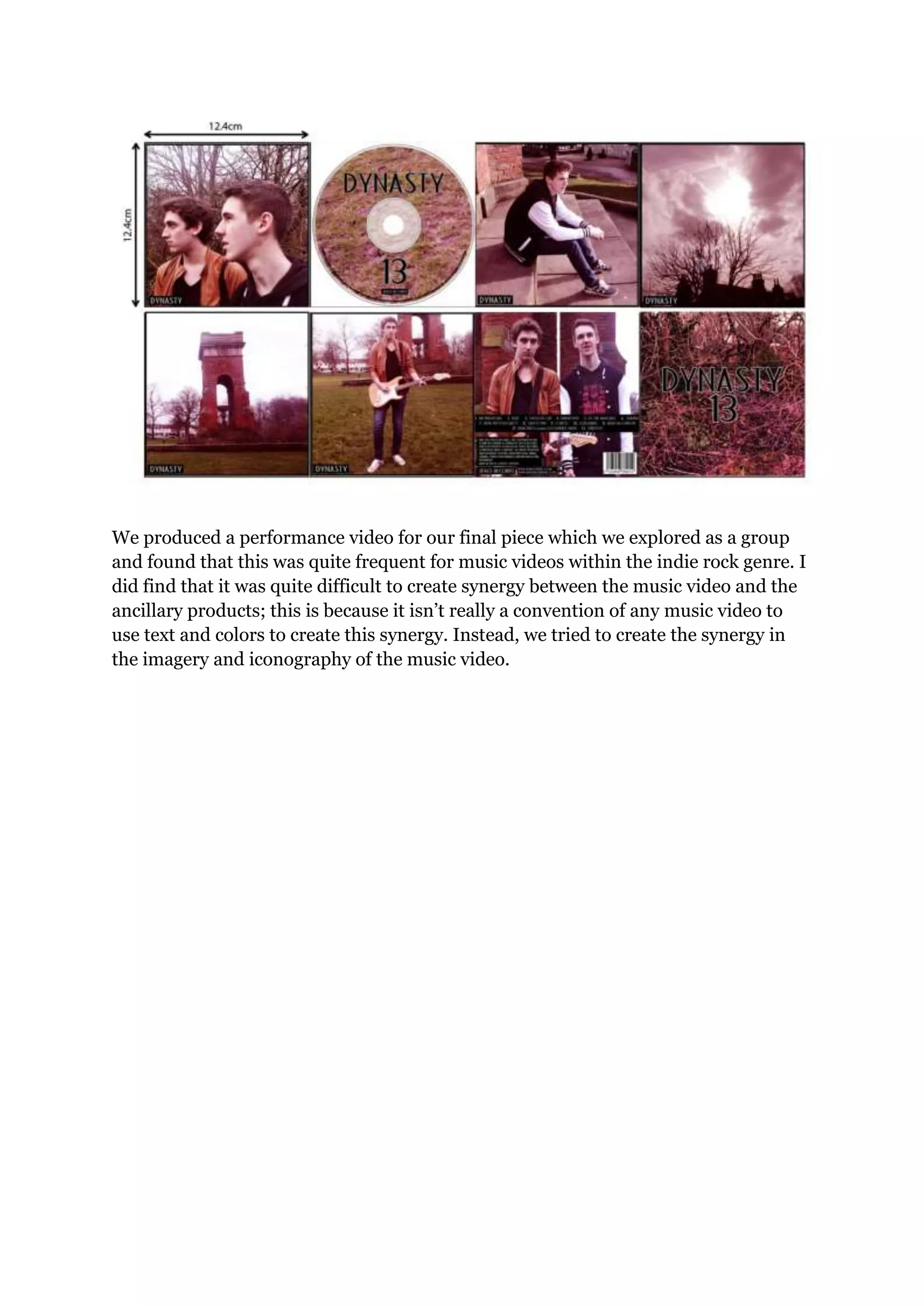The student created 3 media products - a music video and 2 ancillary texts - for a band. They used consistent fonts, colors, imagery and styles across all products to clearly identify them as being from the same band. For the digipak product, the student chose a conceptual, mysterious image of woods from the music video filming location instead of a direct band image, which relates to the indie rock genre. The color, font and logo were kept similar on all inside pages to create synergy between the ancillary pieces. Creating synergy between the music video and other products through consistent imagery and iconography was difficult since music videos don't typically use text and colors.