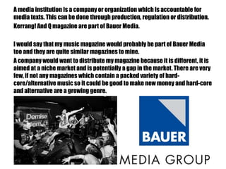 A media company such as Bauer Media would be interested in distributing a new music magazine focused on hardcore and alternative music genres because it targets a niche market that is currently underserved. The magazine could potentially fill a gap in the market and make money by covering growing music genres not well represented in other publications.