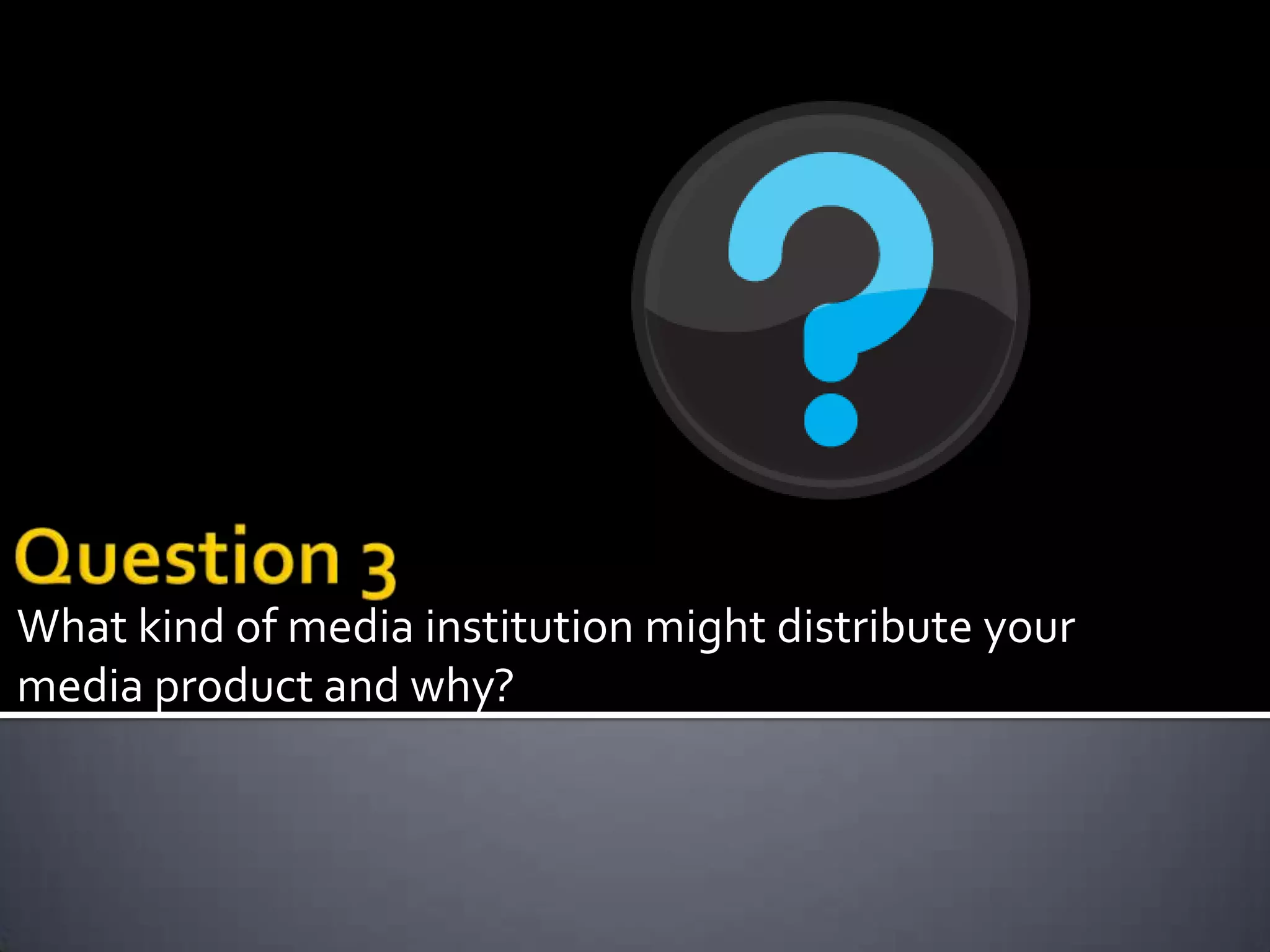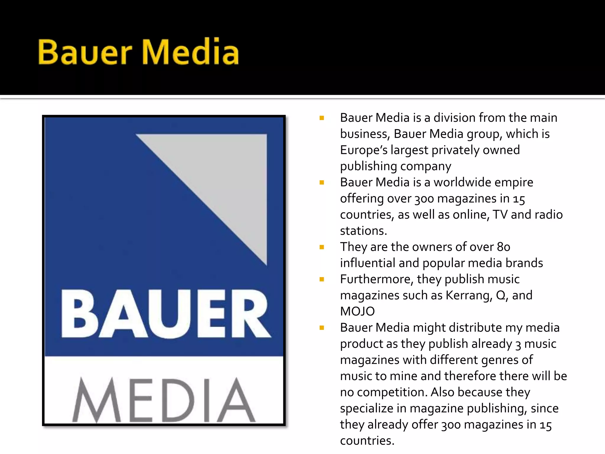 Bauer Media and IPC Media would be suitable media institutions to distribute a new music magazine focused on hip hop and R&B. Bauer Media publishes over 300 magazines globally, including popular music titles like Kerrang, Q, and MOJO. IPC Media publishes iconic brands and only two music magazines, so a new title in hip hop and R&B would face little competition. Both companies' existing music magazine portfolios and international reach mean they could effectively distribute a new music magazine.