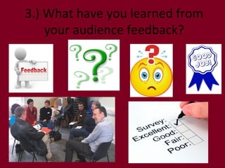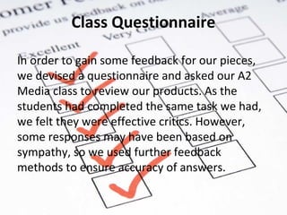 The students created a questionnaire to get feedback on their documentary from their class. Most respondents indicated that the topic, voiceover, music, and flow of the documentary were good. However, nearly half were not interested in the magazine article about the documentary. In response, the students redesigned the article based on further audience feedback. A new survey showed that 14 out of 15 people liked the new article design. The feedback helped the students realize issues with sound levels and overuse of one interview. They learned to spend more time on sound and use more clip variety in future projects.