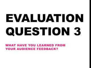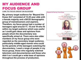The document discusses the audience feedback the student received during the production of a documentary titled "Beyond the Essex Girl". They conducted focus groups with teenagers aged 13-25 and parents to get feedback. Classmates also provided feedback at various stages of production. Google Docs questionnaires allowed the target audience to provide anonymous feedback on draft products. This feedback identified spelling errors, suggested adding statistics and voiceovers, and improved the newspaper advertisement and documentary extract. The final audience feedback helped strengthen the concluding elements. The student found audience feedback crucial to improving their work for the target demographic.
