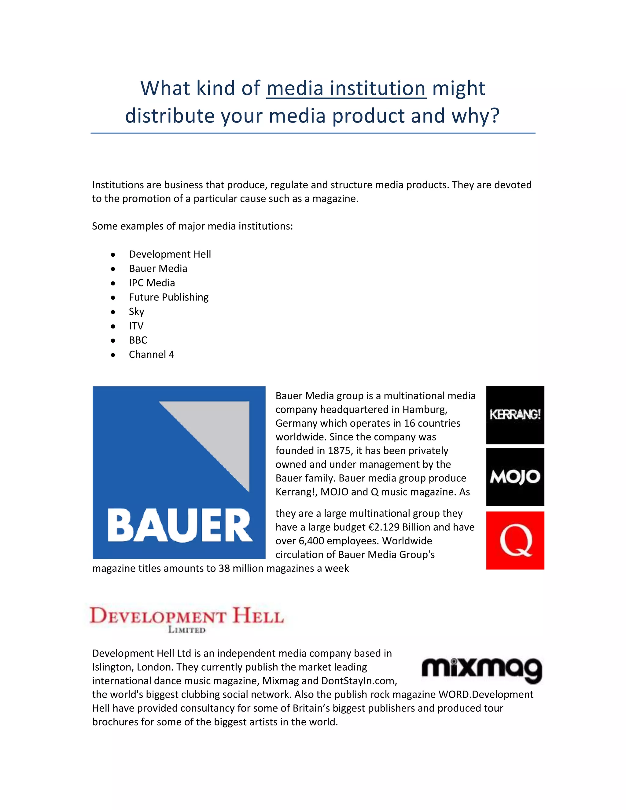 Bauer Media would be a suitable institution to distribute the media product. Bauer Media is a large, multinational media company that publishes popular music magazines such as Kerrang!, MOJO, and Q, reaching a wide audience. As the target audience of the media product would be similar to that of Q magazine, Bauer Media would be a good fit given their experience and ability to reach a large audience. Future Publishing would likely not be the best choice as they focus on niche magazines rather than widely distributed music magazines.