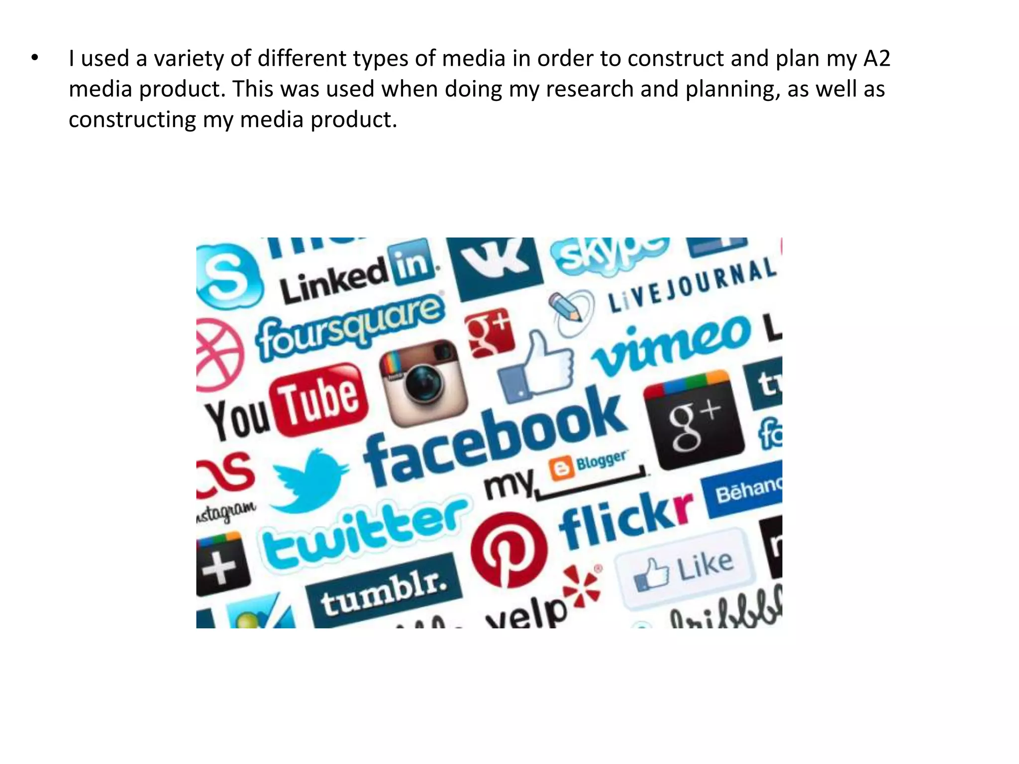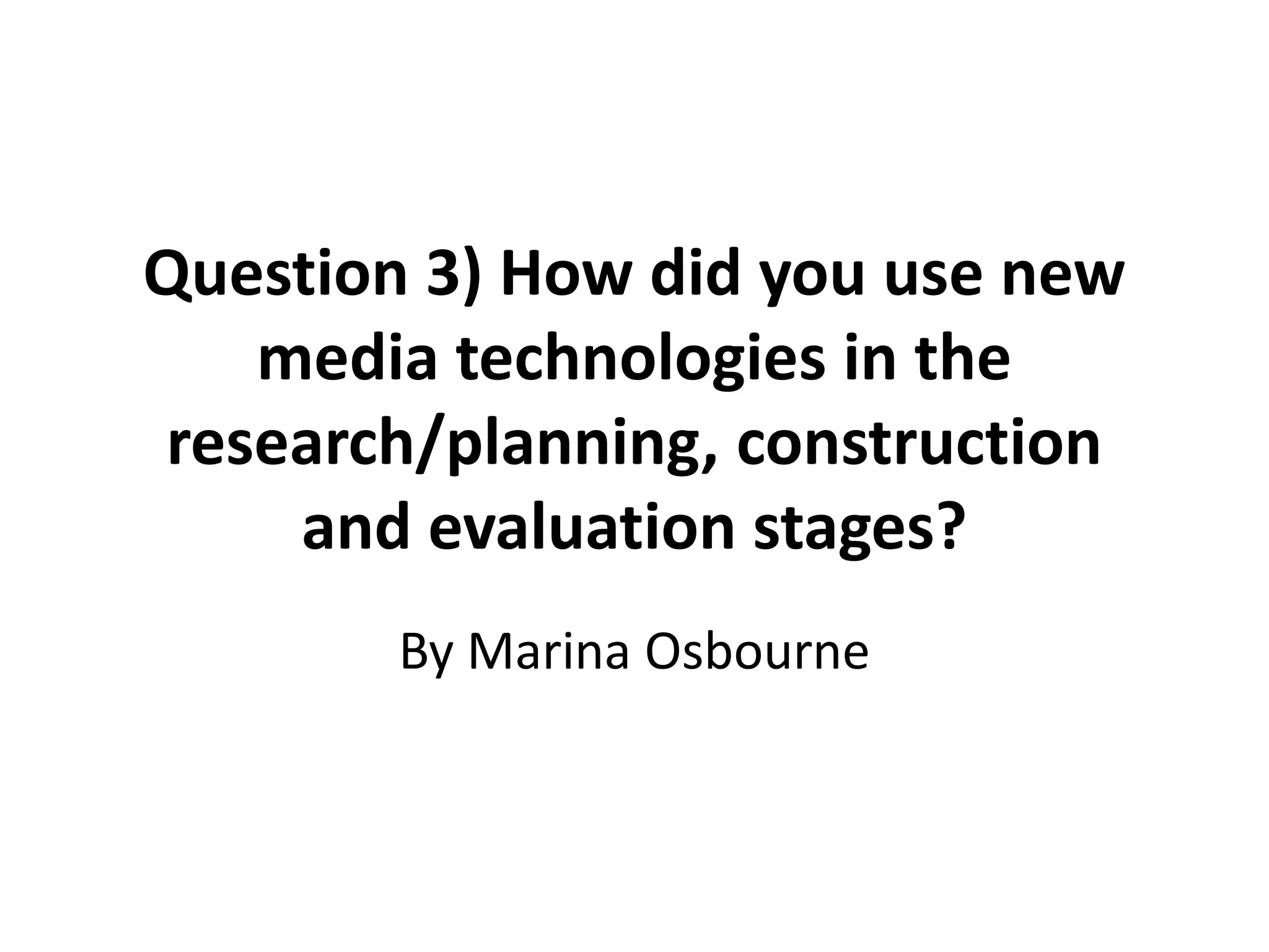 Marina Osbourne used new media technologies throughout the research, planning, construction, and evaluation of her A2 media product. During research and planning, she used Final Cut Pro X to edit research videos and YouTube to find inspiration. For construction, Final Cut Pro X and Photoshop CS6 were used to edit her horror trailer and design magazine/poster visuals. In evaluation, Prezi, Slideshare, Skype, YouTube, and Stupeflix allowed her to create interactive presentations and upload videos to thoroughly explain her media products.
