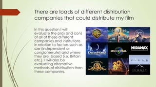 This document evaluates different options for distributing a niche thriller film. It considers independent vs conglomerate distribution companies. Independent companies may be easier to work with but have smaller audience reach, while conglomerates are selective but could expand the audience. Streaming services like Netflix or Amazon Prime are also considered good options as they provide an large international audience and allow profits to be earned. The document concludes that using both a UK-based independent distributor like Optimum Releasing alongside an online streaming service would provide the most effective distribution strategy.