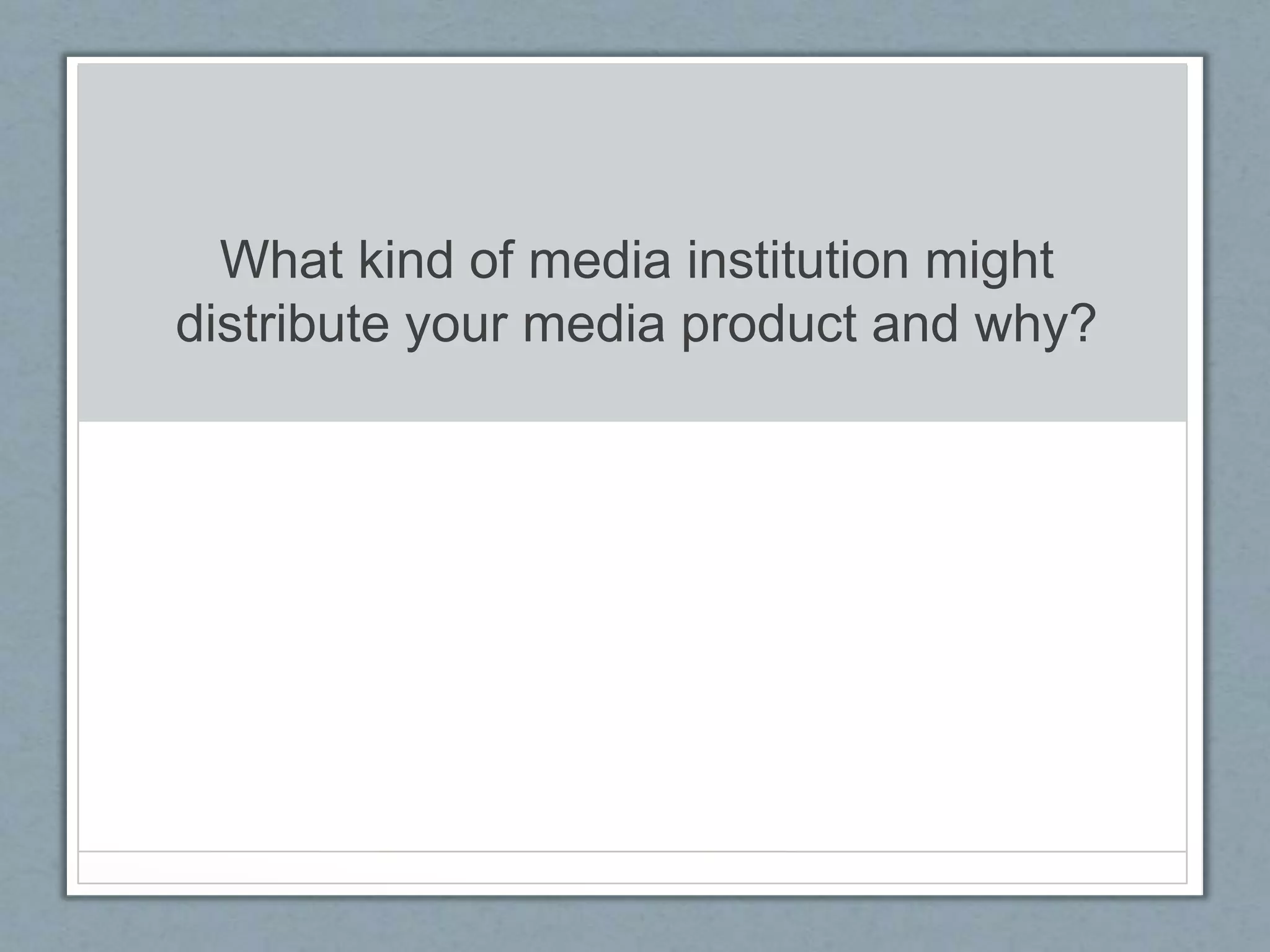 Showtime Networks would be a good potential distributor for the film because they have experience distributing similar thriller genres that deal with bullying and crime stories. Showtime Networks distributes films and TV shows like Scream and Bang Bang You're Dead, which the film is based on. They understand how to market and distribute this type of film. While self-distribution could allow keeping all profits, it would be very time consuming without the industry connections that distributors have.
