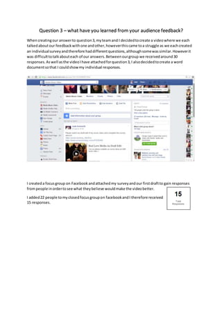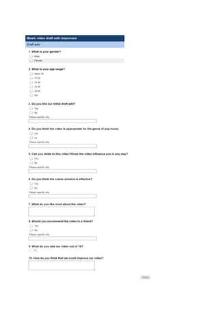The document discusses feedback received from surveys distributed to gather opinions on a music video draft. Key findings include: