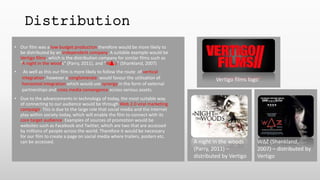 This document discusses suitable distribution options for an independent low-budget film. It suggests that Vertigo Films, which has distributed similar small films, would be a good fit as they specialize in independent films. It also notes that a viral marketing campaign using social media platforms like Facebook and Twitter would be effective given their large user bases. Exhibition strategies discussed include film festival screenings, an art house cinema release, and a simultaneous online/platform release to build an audience.