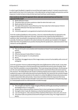 The document provides feedback from students on a magazine advertisement created by the author for an indie music track. The feedback addressed the advertisement's approach, visuals, strengths and weaknesses, what the music video might include, and where the ad could be seen. Most responses were positive about the ad fitting the genre and style. Some noted the image was blurry or had too much going on. The author acknowledges areas for improvement but believes the ambiguous visual successfully conveyed intended complex themes about humanity.