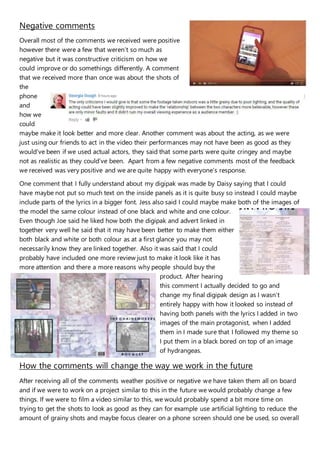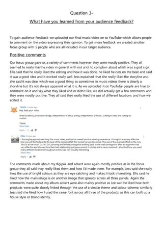 The document summarizes feedback received on a music video project from YouTube comments and a focus group.