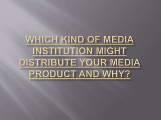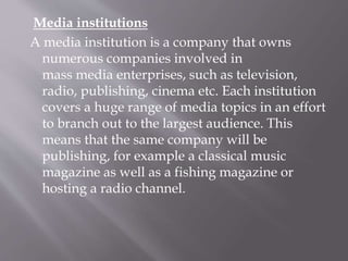 A media institution owns numerous companies involved in mass media across different platforms such as television, radio, publishing and film. Bauer is provided as an example, as it manages over 600 magazines, 400 digital products and 50 radio and TV stations worldwide, publishing both music and fishing magazines. Immediate Media Co. publishes over 70 interest-based brands and the BBC Music Magazine and Radio Times. Time Inc. UK publishes NME and Uncut music magazines for both current and older rock styles. The document concludes that Bauer would be the best institution to partner with to distribute a new rock music magazine, due to their existing music magazine experience and large international audience reach.