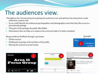 The document discusses feedback received from audiences on a promotional package for a music project. Feedback was gathered through online surveys, focus groups, and sharing content on social media. Focus groups provided detailed feedback that helped improve the music video and packaging. Surveys visually showed what audiences felt was important to include. Social media feedback indicated what worked well in the music video but was less reliable given potential bias. Overall, feedback helped make the products more visually appealing, professionally produced, and ensured they included important elements audiences desired.